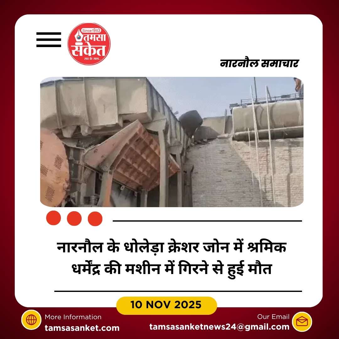 नारनौल।नारनौल के धोलेड़ा क्रेशर जोन में एक मशीन में गिरने से उत्तर प्रदेश के गाजीपुर निवासी धर्मेंद्र (19) की मौत हो गई। युवक देव श्री कृष्णा स्टोन क्रेशर में रात को पत्थर पीसने वाली मशीन पर काम कर रहा था, तभी वह अचानक मशीन में गिर गया।