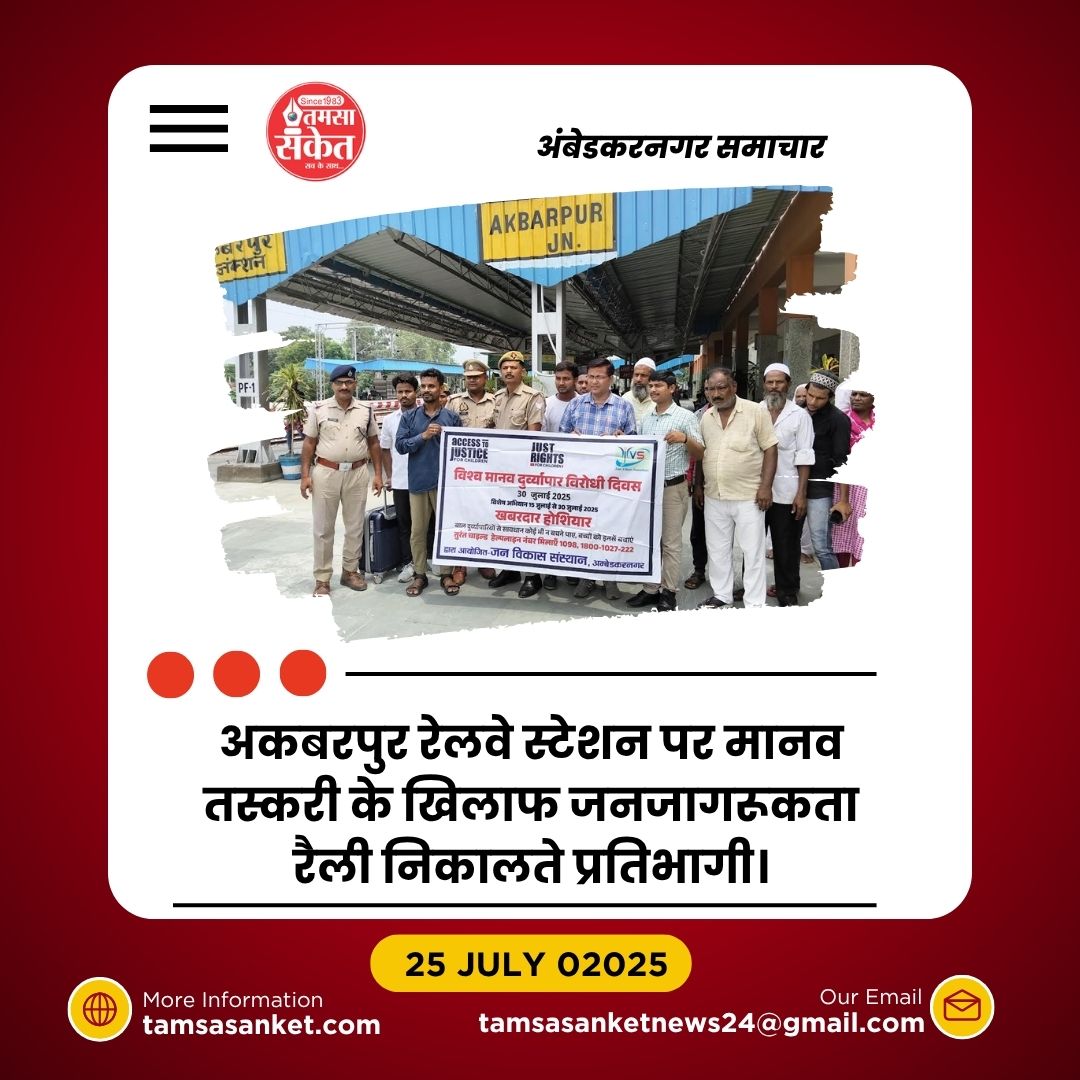 अंबेडकरनगर। विश्व मानव दुर्व्यापार विरोधी दिवस पखवाड़ा के अंतर्गत शुक्रवार को रेलवे स्टेशन अकबरपुर पर जनजागरूकता रैली का आयोजन किया गया। यह कार्यक्रम जनविकास संस्थान द्वारा जस्ट राइट फॉर चिल्ड्रन के सहयोग से संचालित एक्सेस टू जस्टिस परियोजना, एंटी ह्यूमन ट्रैफिकिंग यूनिट (AHTU) टीम तथा रेलवे सुरक्षा बल (RPF) अकबरपुर के संयुक्त तत्वावधान में संपन्न हुआ।