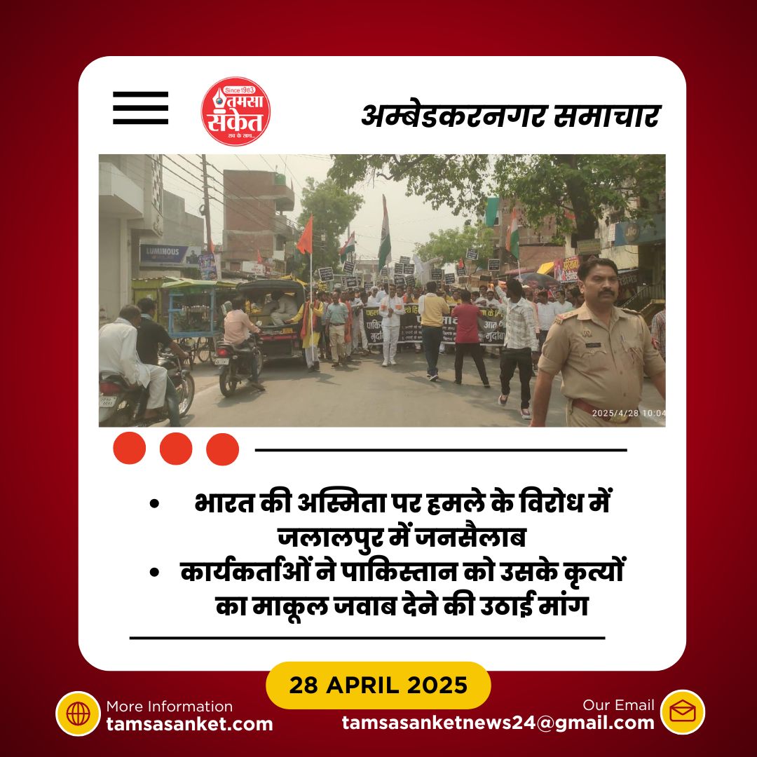 अम्बेडकरनगर।  जम्मू-कश्मीर के पहलगाम में हुए भीषण आतंकी हमले के विरोध में जलालपुर के जलालपुर में सोमवार को भाजपा और विहिप के कार्यकर्ताओं ने जबरदस्त प्रदर्शन किया। पूर्व भाजपा जिला अध्यक्ष राम प्रकाश यादव के नेतृत्व में हुए इस प्रदर्शन में आतंकवाद के खिलाफ आक्रोश फूट पड़ा और पाकिस्तान को लेकर जोरदार नारेबाजी हुई।