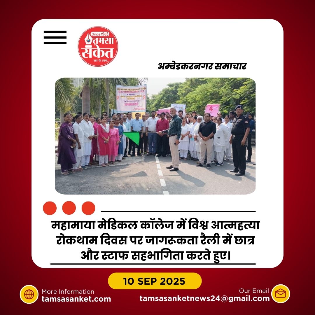 अंबेडकरनगर (संवाददाता)। महामाया राजकीय एलोपैथिक मेडिकल कॉलेज में बुधवार को विश्व आत्महत्या रोकथाम दिवस के अवसर पर एक जागरूकता रैली का आयोजन किया गया। इस रैली का उद्देश्य मानसिक स्वास्थ्य के प्रति जनमानस को जागरूक करना और आत्महत्या जैसी गंभीर सामाजिक समस्या के विरुद्ध एकजुट होकर संदेश देना था।