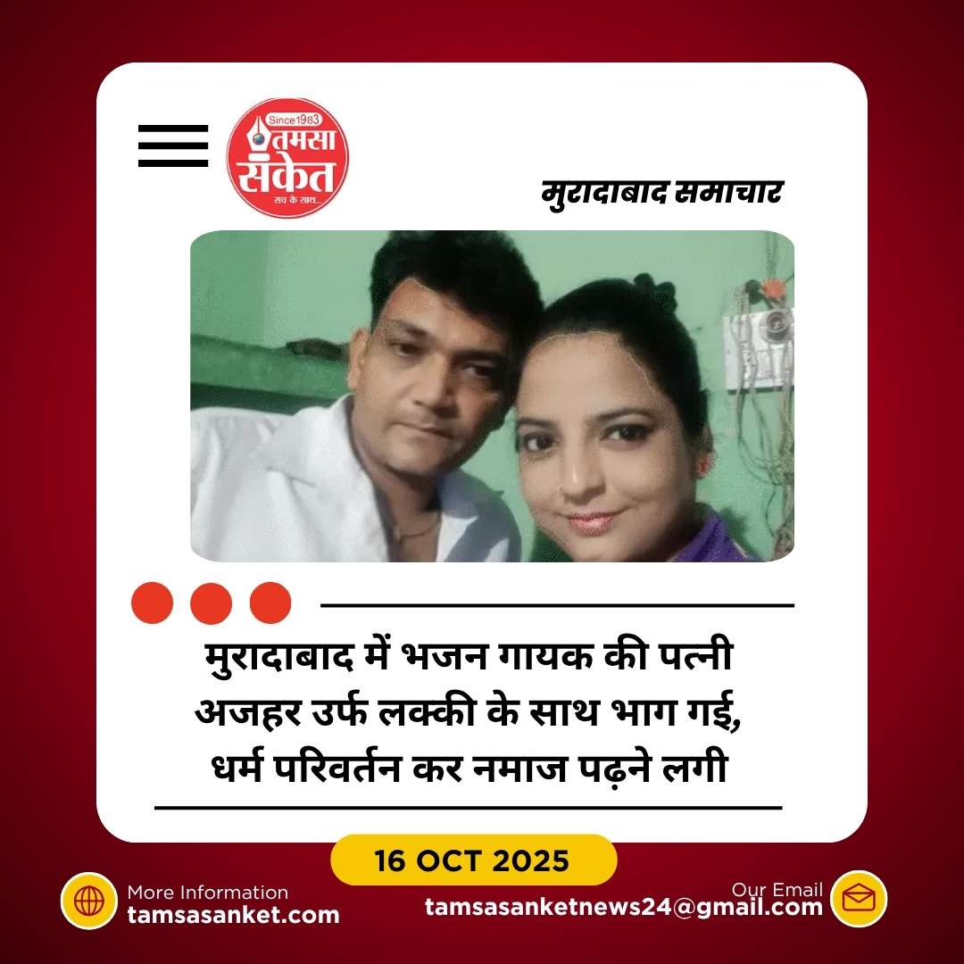 मुरादाबाद। भजन गायक भानू प्रताप सिंह की पत्नी स्वाति शादी के 23 साल बाद अपने मुस्लिम बॉयफ्रेंड अजहर उर्फ लक्की के साथ भाग गई। घटना के बाद महिला ने धर्म परिवर्तन कर पूजापाठ छोड़ दिया और नमाज पढ़ना शुरू कर दिया। उसने बच्चों को भी सनातन धर्म छोड़ इस्लाम अपनाने के लिए प्रभावित किया।