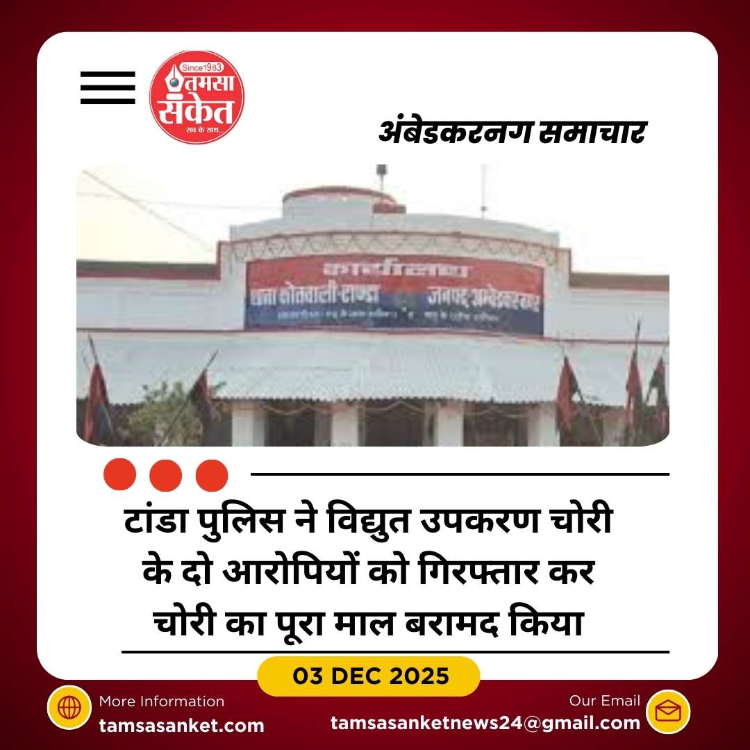 अम्बेडकरनगर। टांडा क्षेत्र में विद्युत विभाग के उपकरणों की चोरी के मामले में पुलिस ने बड़ी सफलता हासिल की है। कोतवाली टांडा में दर्ज मामले की जांच करते हुए पुलिस टीम ने दो आरोपियों को गिरफ्तार कर चोरी गया पूरा सामान बरामद कर लिया। बरामदगी में 72 बुसिंग रॉड/फ्यूज रॉड शामिल हैं, जिन्हें चोरी कर बाजार में खपाने की तैयारी की जा रही थी।
