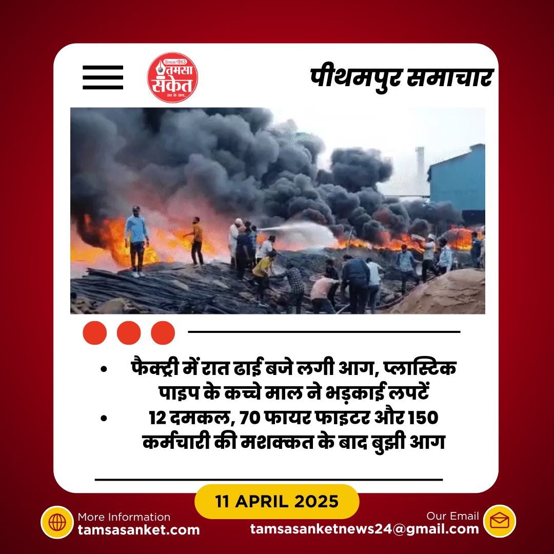 पीथमपुर। धार के पीथमपुर इंडस्ट्रियल एरिया स्थित सिग्नेट पाइप फैक्ट्री में गुरुवार- शुक्रवार देर रात आग लग गई। आग पर काबू पाने में 9 घंटे लगे। दमकल की 12 गाड़ियों, 1000 लीटर फोम और 25 डंपर रेत का इस्तेमाल किया गया। आसपास की फैक्ट्रियों को बचाने के लिए जेसीबी से मिट्टी-रेत की दीवार बनाई गई।