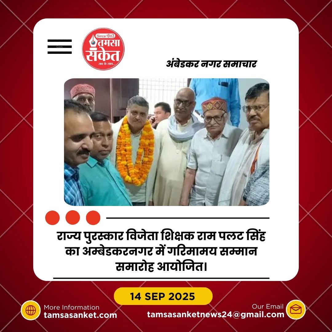 अम्बेडकरनगर। जनपद में रविवार को शिक्षा क्षेत्र के प्रतिष्ठित हस्ताक्षर और राज्य पुरस्कार से सम्मानित शिक्षक राम पलट सिंह का सम्मान समारोह गरिमामय वातावरण में संपन्न हुआ।
