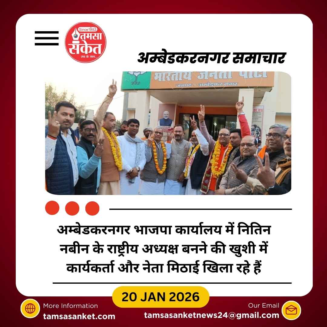 नितिन नबीन को भाजपा का निर्विरोध राष्ट्रीय अध्यक्ष चुने जाने पर बधाई देते हुए भाजपा जिलाध्यक्ष त्रयंबक तिवारी ने कहा कि युवा नेता नितिन नबीन जी के नए राष्ट्रीय अध्यक्ष चुने जाने से युवाओं में जोश भर गया है। कहा कि भाजपा ने युवा राष्ट्रीय अध्यक्ष देकर यह साबित कर दिया है कि भारत और युवाओं के भविष्य के लिए भाजपा ही सदैव चिंतनशील रहती है। उत्तर प्रदेश सहकारी ग्राम्य विकास बैंक के टांडा,अकबरपुर और जलालपुर की शाखा से भाजपा नेताओं का दूसरी बार निर्विरोध निर्वाचित होना भाजपा की जन जन में स्वीकार्यता सिद्ध करता है। कहा कि आने वाले समय में   हर चुनाव भगवामय होगा।