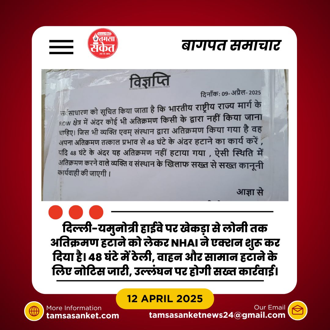 बागपत। राष्ट्रीय राजमार्ग प्राधिकरण (NHAI) ने दिल्ली-यमुनोत्री नेशनल हाईवे (NH-919) पर अतिक्रमण हटाने की कार्रवाई तेज कर दी है। खेकड़ा से लोनी पुश्ते तक के हाईवे सेक्शन पर अतिक्रमण हटाने के लिए 48 घंटे का नोटिस जारी किया गया है।