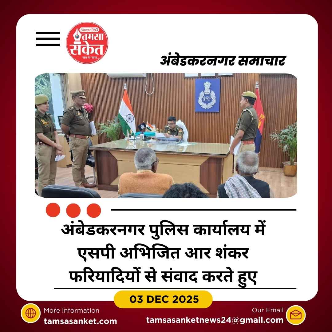 अंबेडकरनगर। पुलिस कार्यालय में आयोजित जनसुनवाई में एसपी अभिजित आर शंकर ने मंगलवार को फरियादियों की समस्याएँ विस्तारपूर्वक सुनीं। जनसुनवाई में आए प्रत्येक आवेदक को अपनी बात रखने का अवसर दिया गया। एसपी ने पूरी गंभीरता के साथ प्रकरणों को सुनते हुए फरियादियों को न्याय का भरोसा दिलाया और उनके मामलों के त्वरित व निष्पक्ष निस्तारण के लिए संबंधित अधिकारियों को आवश्यक निर्देश जारी किए।