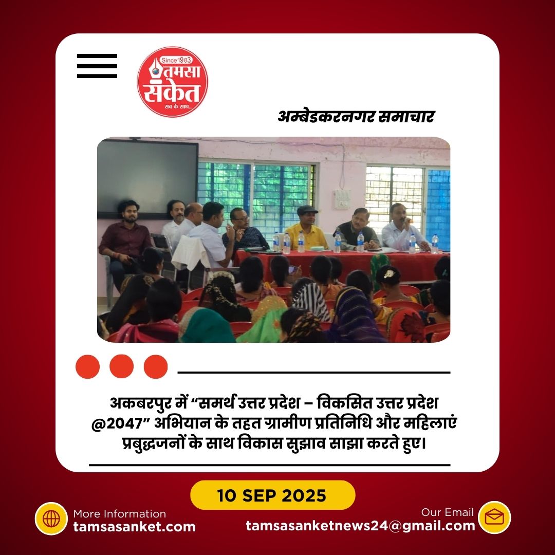 अम्बेडकरनगर, संवाददाता। “समर्थ उत्तर प्रदेश – विकसित उत्तर प्रदेश @2047” अभियान के अंतर्गत बुधवार को विकासखंड अकबरपुर के सभागार में जन पहल एवं संवाद कार्यक्रम का आयोजन किया गया। इस अवसर पर शासन द्वारा नामित प्रबुद्धजनों की उपस्थिति में ग्रामीण प्रतिनिधियों, स्वयं सहायता समूह की महिलाओं, आशा कार्यकर्ताओं और पंचायत सचिवों के साथ सीधा संवाद स्थापित किया गया।