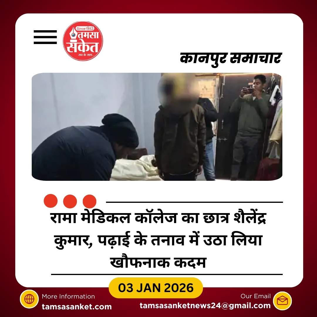 कानपुर। कानपुर के रामा मेडिकल कॉलेज से एक दर्दनाक मामला सामने आया है। कॉलेज के एक छात्र ने फांसी लगाकर आत्महत्या कर ली। मृतक की पहचान शैलेंद्र कुमार (27) के रूप में हुई है, जो मूल रूप से चित्रकूट जनपद का रहने वाला था। शैलेंद्र मेडिकल कॉलेज में थर्ड ईयर का छात्र था और पढ़ाई को लेकर लंबे समय से मानसिक तनाव में चल रहा था।
