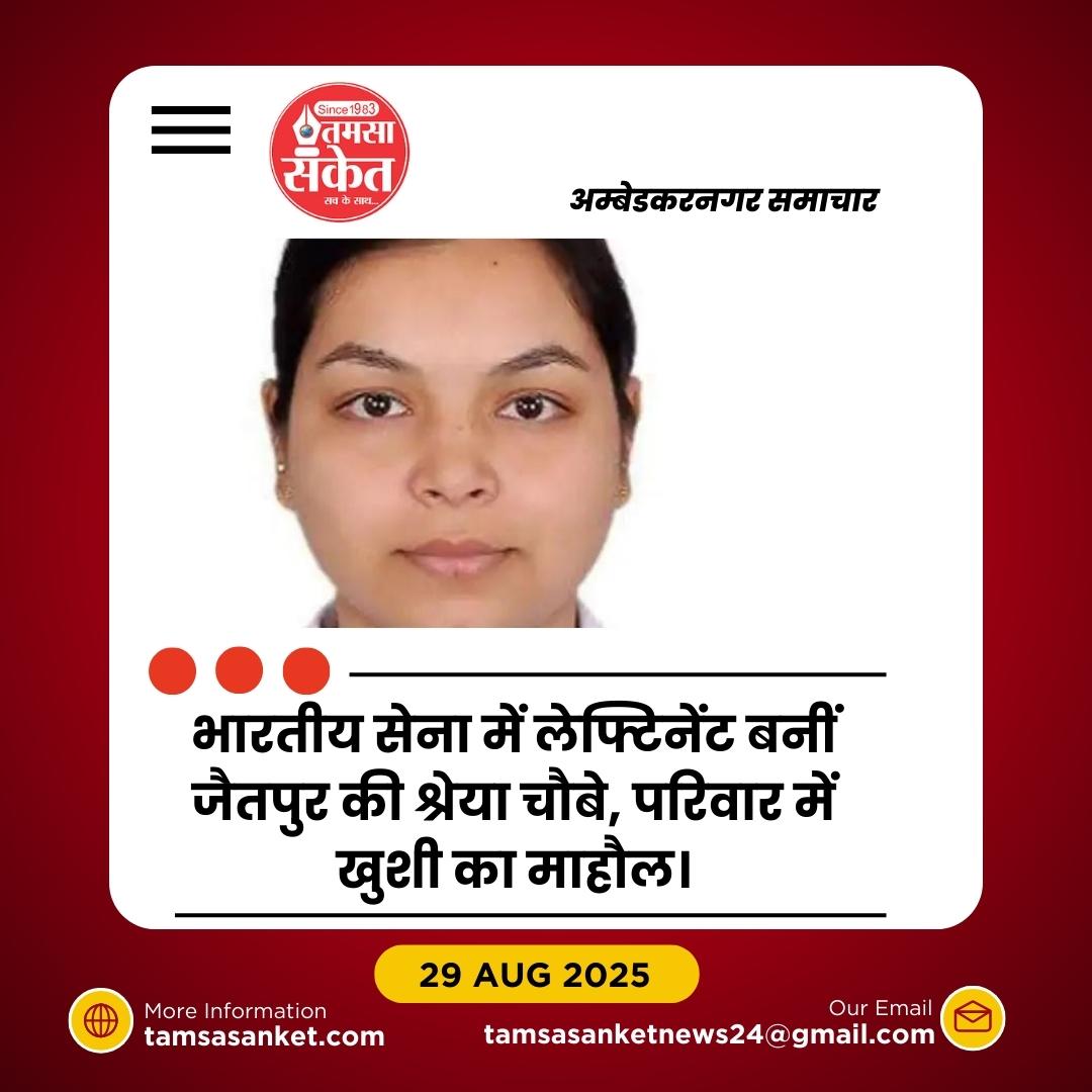 अम्बेडकरनगर (जैतपुर): ग्राम पंचायत जैतपुर के मजरे टिकरी चौबाना की श्रेया चौबे ने भारतीय थल सेना में लेफ्टिनेंट का पद हासिल कर जिले का नाम रौशन किया है। श्रेया का चयन भारतीय सेना में शॉर्ट सर्विस कमीशन टेक्निकल एंट्री के तहत हुआ है। यह उपलब्धि जिले के युवाओं के लिए प्रेरणा का स्रोत बनी है।