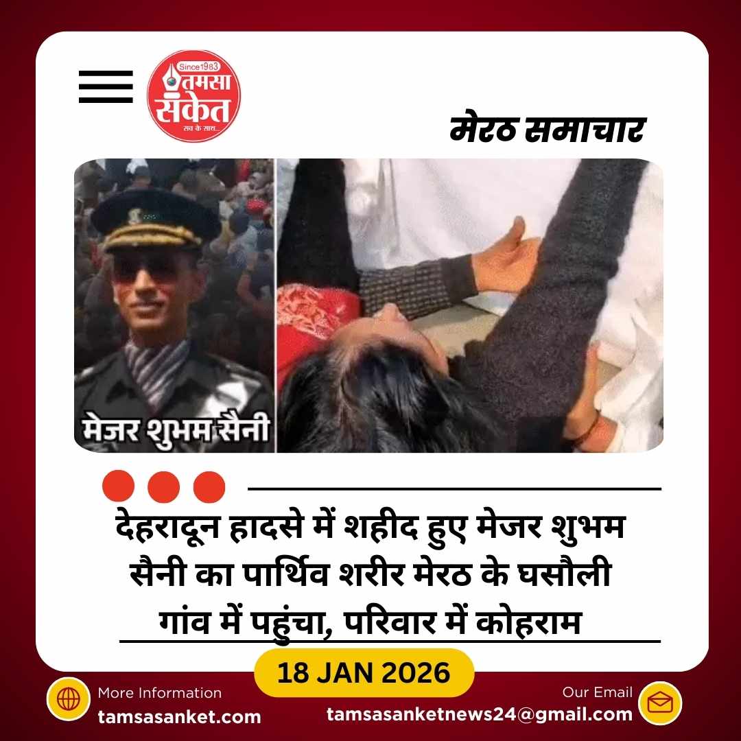मेरठ। देहरादून में सड़क हादसे में शहीद हुए मेजर शुभम सैनी का पार्थिव शरीर शनिवार को उनके पैतृक गांव घसौली, मेरठ पहुंचा। जैसे ही शुभम का शव गांव में देखा गया, चीख-पुकार मच गई। परिवार के लोग बुरी तरह टूट गए; मां और बहन बार-बार बेहोश हो रही थीं। परिवार वाले उन्हें संभालते और पानी के छींटे डालकर होश में लाते रहे।