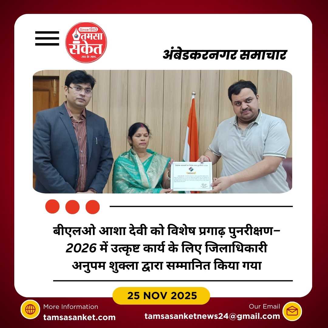 अंबेडकर नगर में विशेष प्रगाढ़ पुनरीक्षण–2026 के अंतर्गत मतदाता सूची अद्यतन अभियान में उत्कृष्ट प्रदर्शन करने पर बीएलओ आशा देवी को जिलाधिकारी अनुपम शुक्ला ने सम्मानित किया। बूथ संख्या 244, प्राथमिक विद्यालय धौरहरा (विधानसभा 278 टांडा) पर नियुक्त बीएलओ आशा देवी ने अपने कार्यक्षेत्र में उदाहरण स्थापित करते हुए समय पर सौ फीसदी कार्य पूर्ण किया।