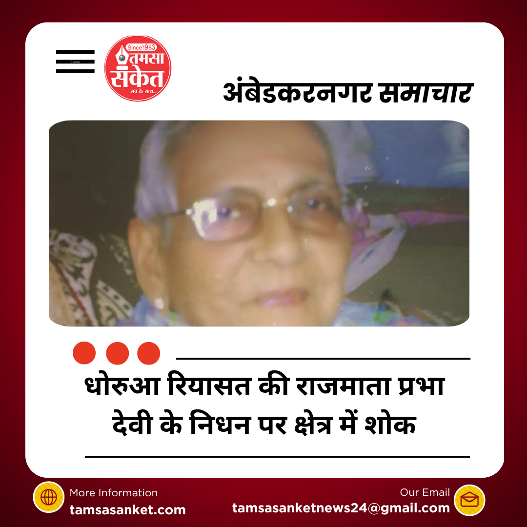 अम्बेडकरनगर। मालीपुर थाना क्षेत्र अंतर्गत धोरुआ रियासत की राजमाता प्रभा देवी का 6 अप्रैल 2026 को शाम 6:30 बजे धोरुआ राज भवन में निधन हो गया। राजमाता की आयु 97 वर्ष थी। उनका निधन होने से क्षेत्र में शोक का माहौल व्याप्त हो गया है।