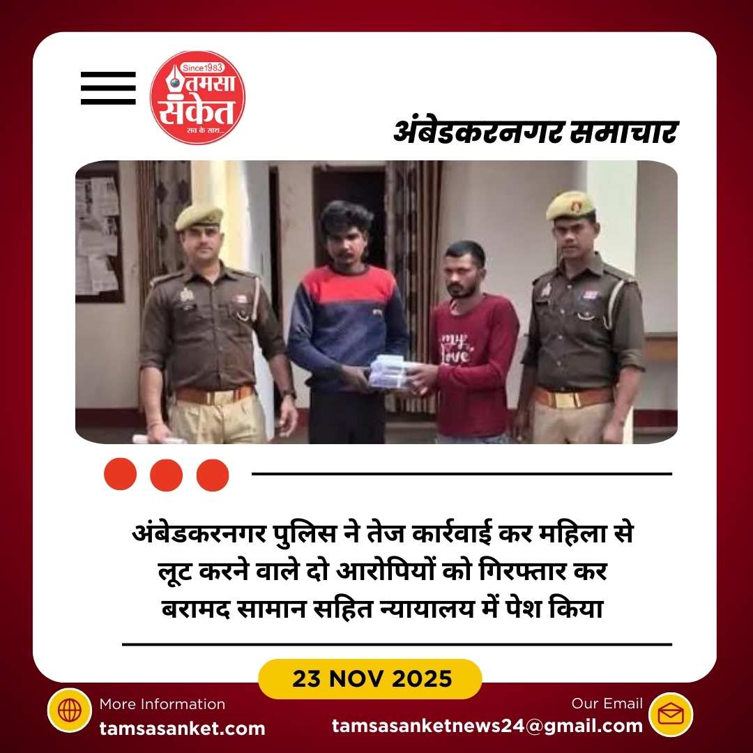 अम्बेडकरनगर पुलिस ने तेज कार्रवाई करते हुए मोबाइल फोन और सोने का लॉकेट छीनकर भाग रहे दो शातिर लुटेरों को गिरफ्तार कर लिया। यह घटना 22 नवंबर 2025 को सम्मनपुर थाना क्षेत्र में हुई, जहां पीड़िता की चीख सुनकर ग्रामीणों ने तत्परता दिखाते हुए बदमाशों को घेरा और पुलिस को सूचना दी। पुलिस ने त्वरित प्रतिक्रिया देते हुए दोनों को अमरौला जैनापुर पुल के पास से गिरफ्तार कर लिया।