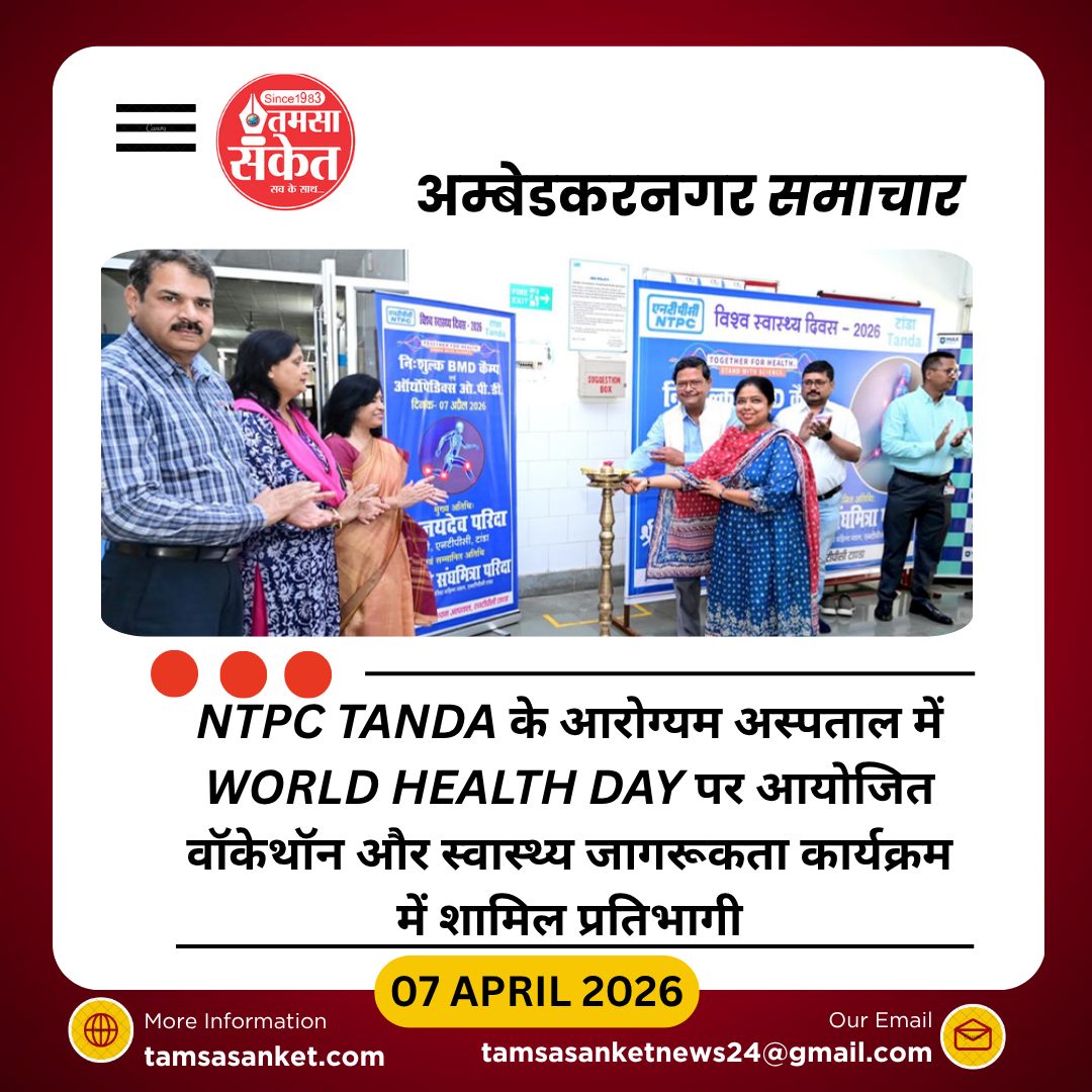 अंबेडकरनगर । विश्व स्वास्थ्य दिवस 2026 के अवसर पर एनटीपीसी टांडा के आरोग्यम अस्पताल द्वारा “स्वास्थ्य के लिए एकजुट-विज्ञान के साथ खड़े रहे” थीम के तहत विभिन्न स्वास्थ्य कार्यक्रमों का आयोजन किया गया। यह आयोजन कर्मचारियों, विद्यार्थियों और स्थानीय नागरिकों को स्वस्थ जीवनशैली अपनाने के प्रति जागरूक करने के उद्देश्य से आयोजित किया गया।