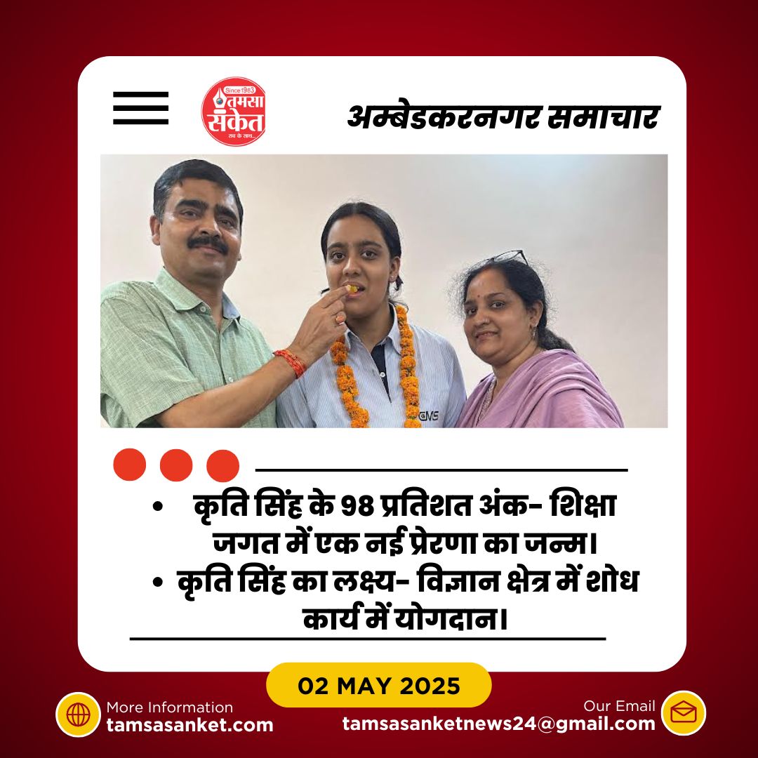 अम्बेडकरनगर। जनपद के खेमापुर गांव की निवासी और वर्तमान में लखनऊ में अध्ययनरत कृति सिंह ने आईसीएसई बोर्ड की इंटरमीडिएट परीक्षा में 98 प्रतिशत अंक प्राप्त कर शैक्षिक क्षेत्र में एक बड़ी उपलब्धि हासिल की है। कृति की इस सफलता से उनके परिजनों, शिक्षा जगत से जुड़े लोगों और क्षेत्रवासियों में खुशी का माहौल है।