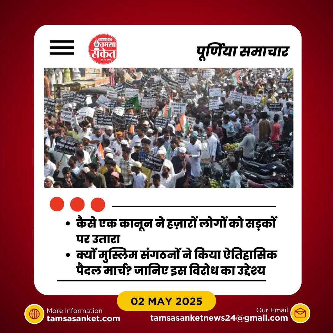 पूर्णिया। पूर्णिया शहर में वक्फ कानून और पहलगाम आतंकी हमले के विरोध में शुक्रवार को एक बड़ा पैदल मार्च निकाला गया। जुमे की नमाज़ के बाद लाइन बाजार स्थित जामा मस्जिद से शुरू हुए इस प्रदर्शन में जिले भर से हज़ारों लोग शामिल हुए। प्रदर्शनकारियों ने हाथों में काली पट्टियां बांध रखी थीं और वक्फ कानून वापसी तथा पहलगाम हमले के दोषियों को सज़ा दिलाने की मांग को लेकर नारेबाजी की।