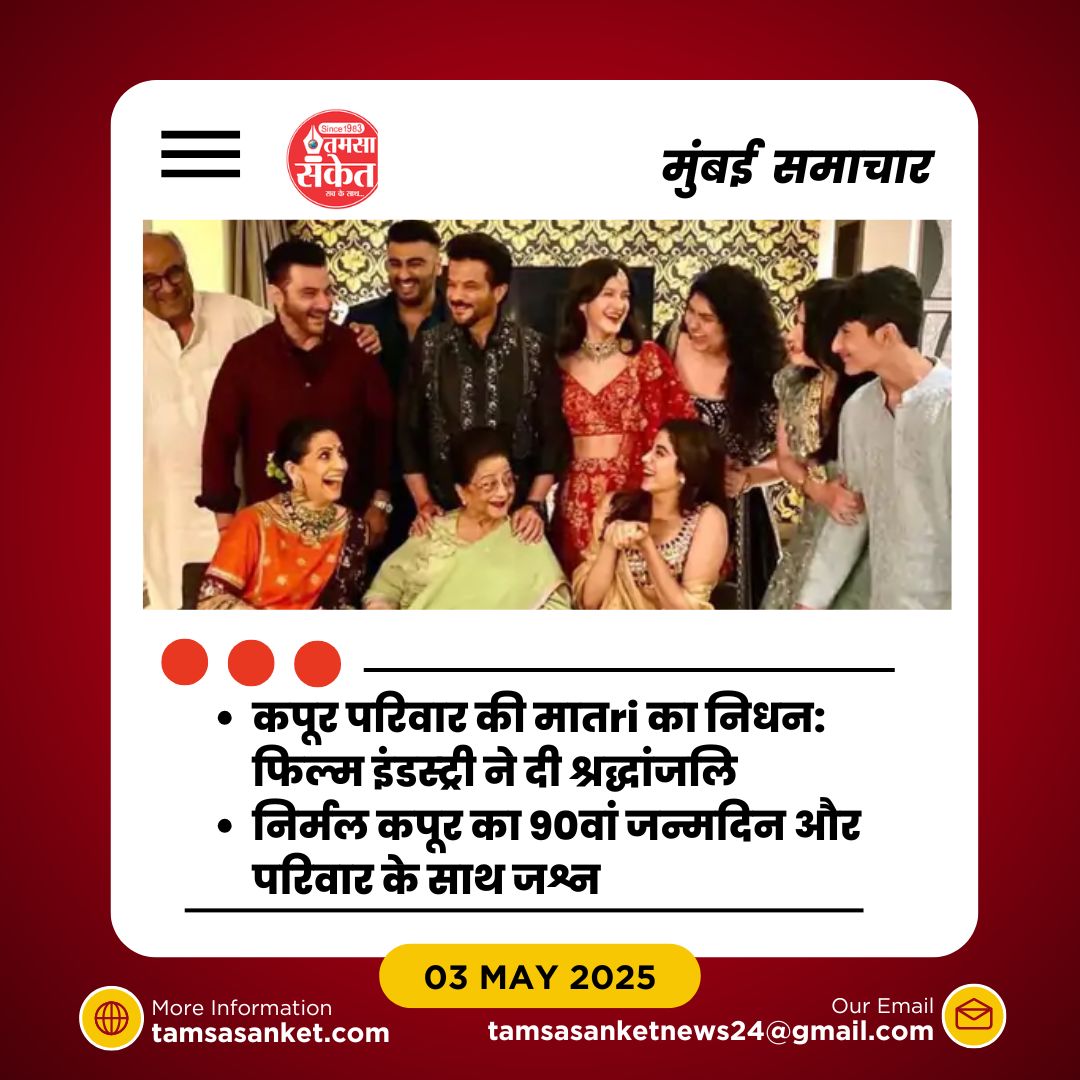 मुंबई। बॉलीवुड के प्रमुख निर्माता बोनी कपूर और अभिनेता अनिल कपूर की मां, निर्मल कपूर, का शुक्रवार को मुंबई के कोकिलाबेन धीरूभाई अंबानी अस्पताल में निधन हो गया। वह 90 वर्ष की थीं। उनका अंतिम संस्कार विले पार्ले श्मशान घाट में संपन्न हुआ, जहां परिवार के सदस्यों और बॉलीवुड के कई नामचीन सितारों ने नम आंखों से उन्हें अंतिम विदाई दी।